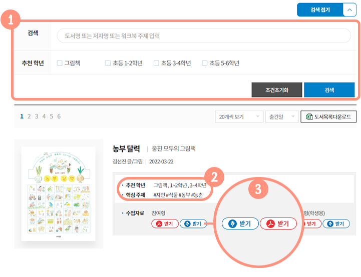 ① 찾고자 하는 도서명과 학년, 도서 주제로 워크북을 검색하실 수 있습니다.