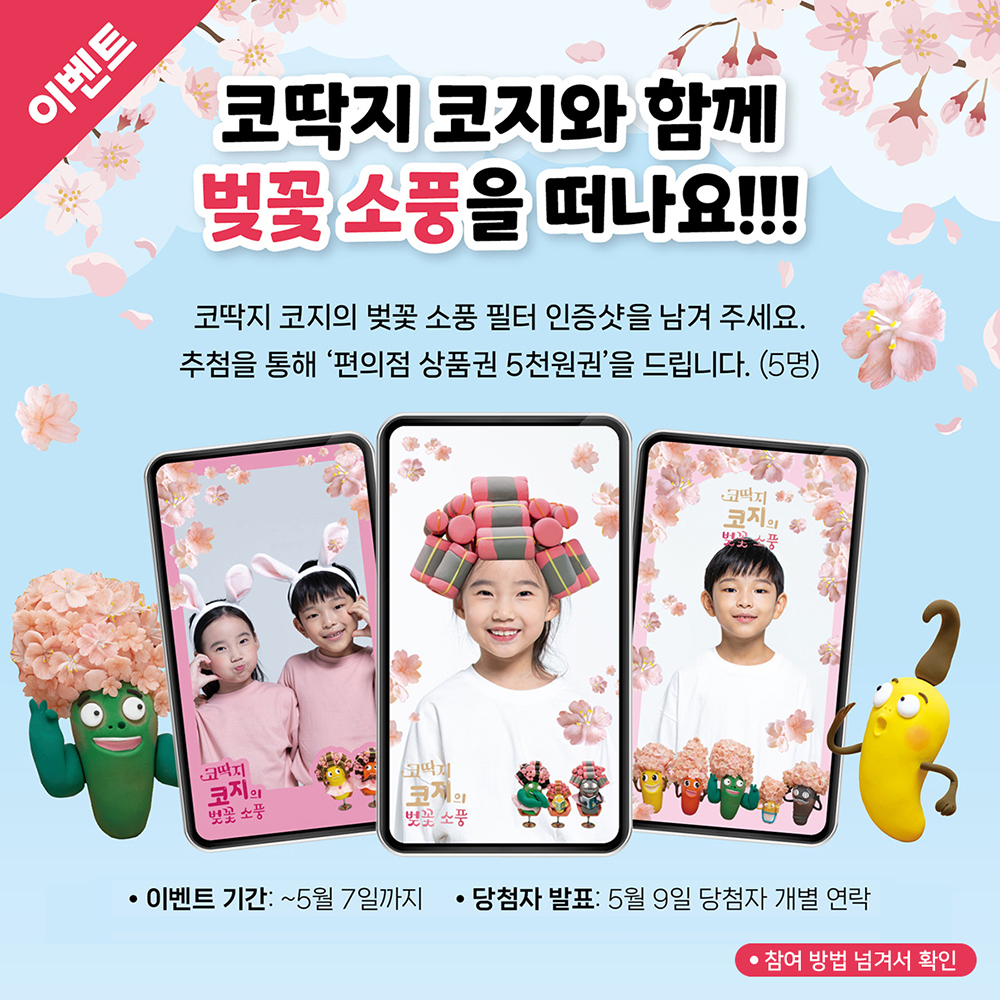 『코딱지 코지의 벚꽃 소풍』필터로 사진 찍고, 벚꽃의 아쉬움을 날려 보세요.