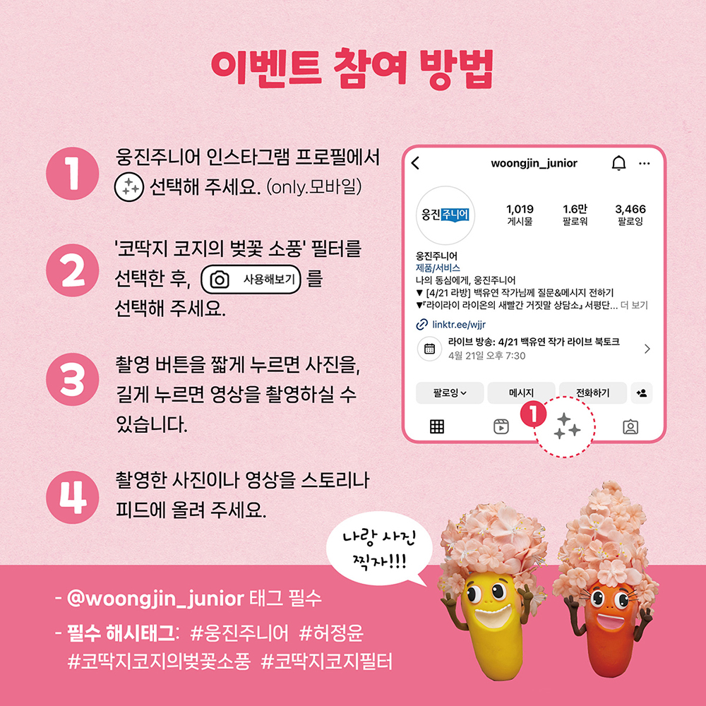 『코딱지 코지의 벚꽃 소풍』 필터는 웅진주니어 인스타그램에서 만나실 수 있습니다.