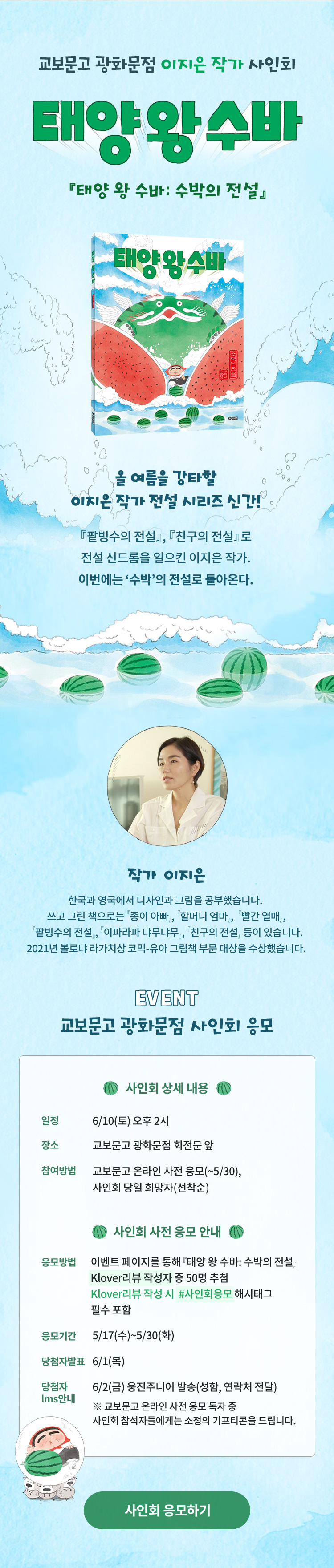 [이벤트] 『태양 왕 수바: 수박의 전설』이지은 작가 사인회에 여러분을 초대합니다. (6월 10일, 교보문고 광화문점)