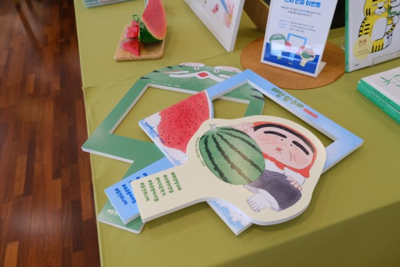 동아서점 창가 테이블 끝에 마련된 색연필과 이벤트 종이에 책 속 주인공을 그려 주세요.(팥 할머니, 태양 왕 수바, 둘 머리 용)