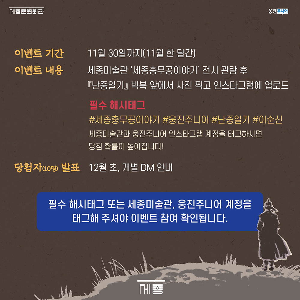 - 세종미술관에서 '세종충무공이야기' 전시 관람 후 『난중일기』 빅북 앞에서 사진 찍고 인스타그램 업로드해 주세요.