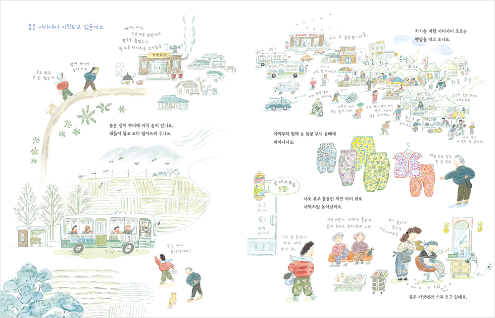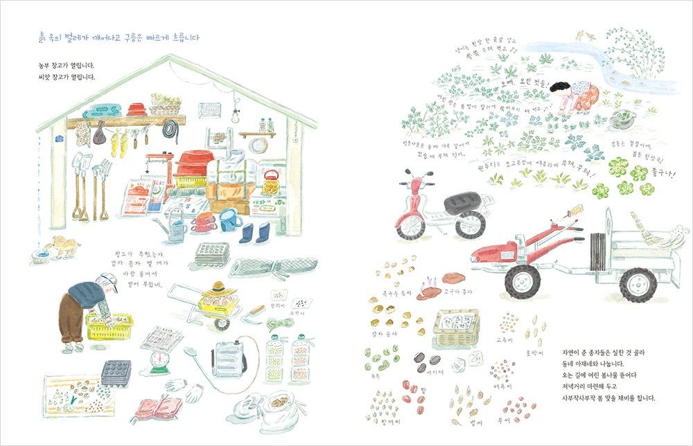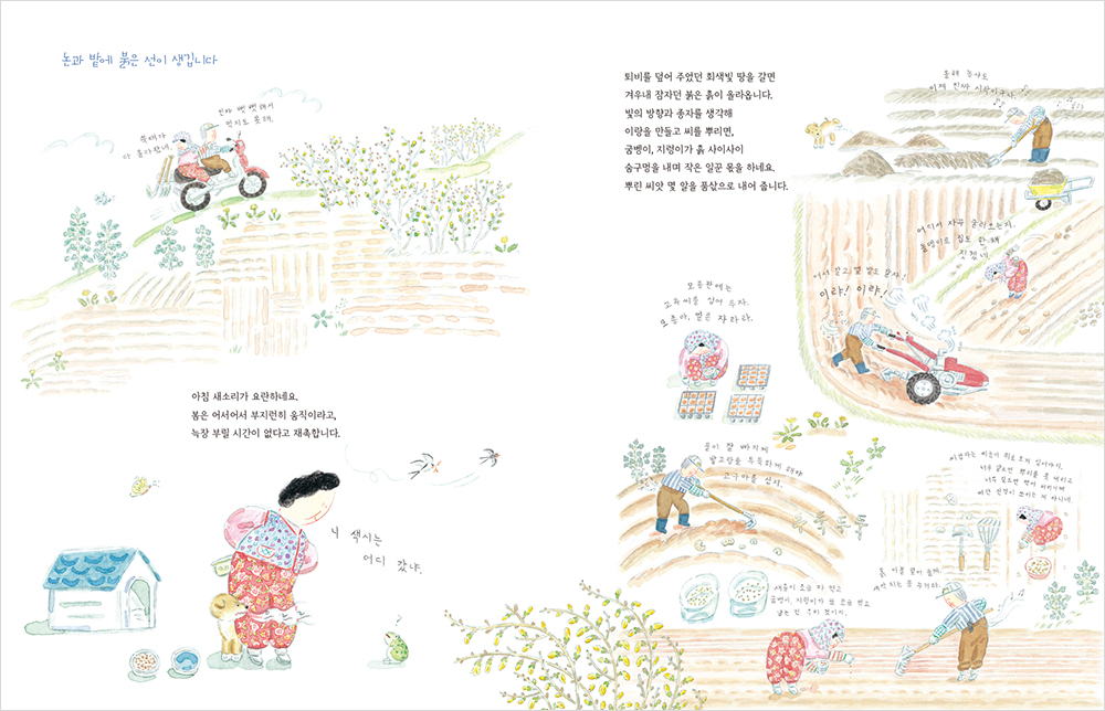 이 책은 한국의 작은 시골마을의 노부부와 강아지 동구의 사계절 속에 작은 농사일들을 그린 그림책입니다. 오랫동안 농사를 지으신 저의 부모님들을 모델로 했기 때문에 더 자연스럽고 공감 가는 그림책이 되지 않았나 싶습니다. 부모님의 농사짓는 모습들이나 대화하는 모습들, 저의 어린 시절 시골에 살던 모습들을 떠올리며 사계절들을 최대한 잘 전달 드리려고 애썼던 것 같아요.