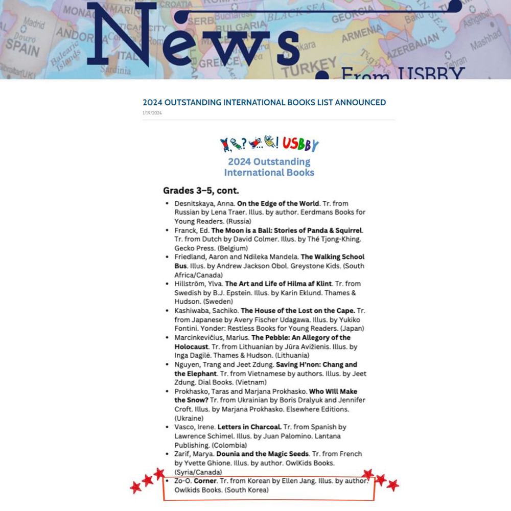 조오 작가 『나의 구석』 2024년 USBBY(미국 아동청소년도서협의회) 우수 국제 도서 선정을 축하해 주세요.