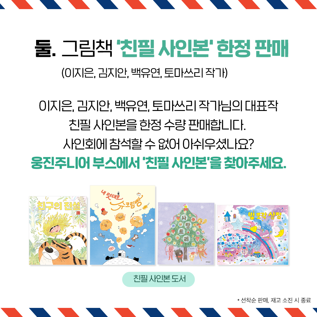 - 3만 원 이상 구매 시: 도서전 기념 "우표 스티커"+"웅진주니어 수건" 증정