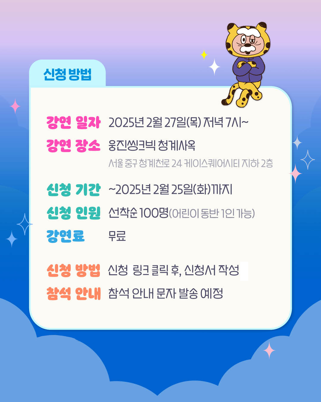 - 강연 장소: 웅진씽크빅 청계사옥 (서울 중구 청계천로 24 케이스퀘어시티 지하 2층)
